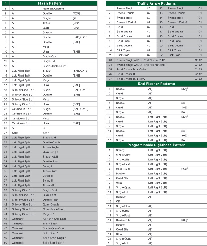 De Horizon heeft 11 programmeerbare pijlpatronen en 27 waarschuwingspatronen. De buitenste units kunnen als eindflitsers worden geprogrammeerd, met 12 verschillende patronen die afzonderlijk kunnen flitsen, onafhankelijk van de pijlpatronen. De Horizon traffic advisor wordt ook wel: arrowbar, verkeersgeleider, looplicht, traffic director, directionele balk of verkeerspijl genoemd.