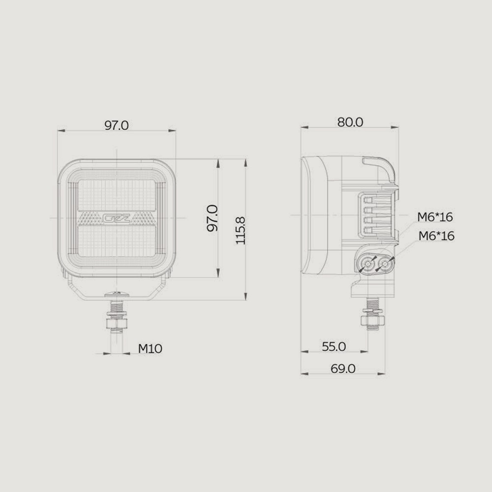 Dankzij het compacte 3-inch formaat biedt de OZZ SQR vrijwel onbeperkte montageopties. De lamp past eenvoudig op plekken waar standaard werklampen te groot zijn en kan discreet worden geïntegreerd in voertuigen en machines.