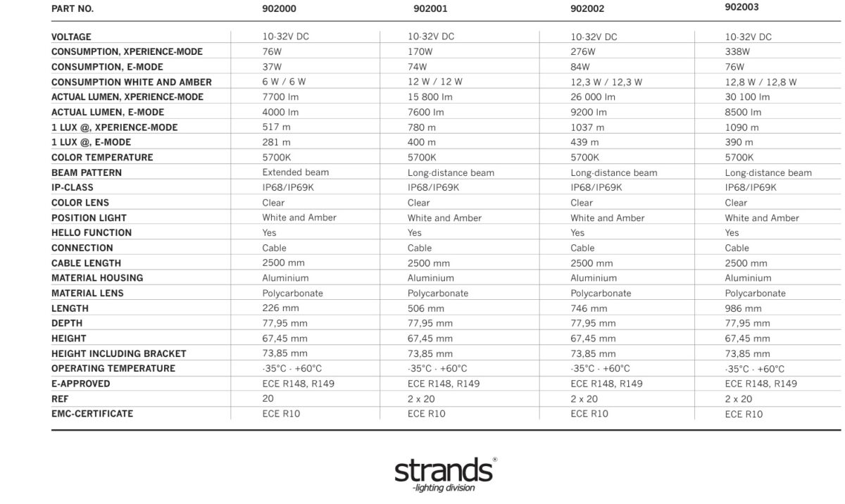 - Bevestigingsmateriaal: ringen, bouten, rubberen pads, zijbeugels, ophangbeugels, rubberen afdekkappen met Strands-logo, kabelboom voor XBB, waterdichte krimpverbinders (Duraseals)
