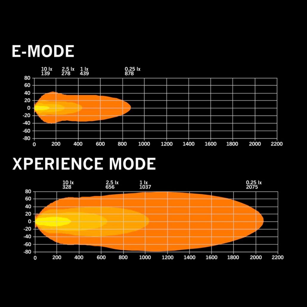 De lamp beschikt over twee standen die eenvoudig zijn af te stemmen op de situatie. De E-mode is geschikt voor regulier weggebruik, terwijl de krachtige Xperience-modus maximale verlichting biedt wanneer je off-road rijdt of werkt in donkere omgevingen zoals bouwplaatsen of boswegen.