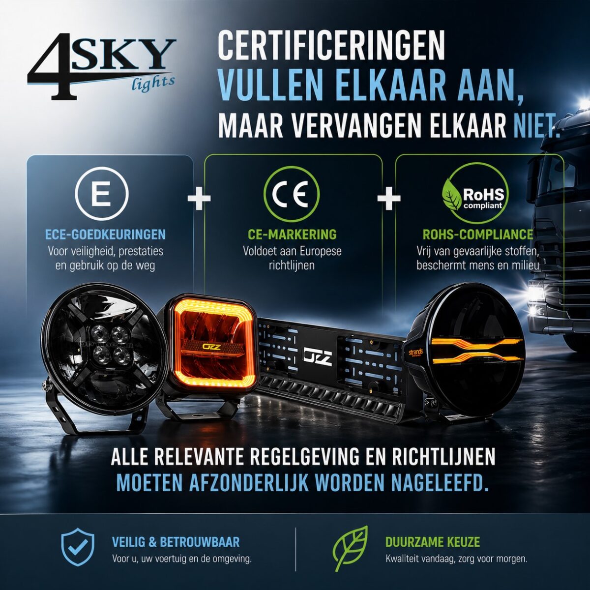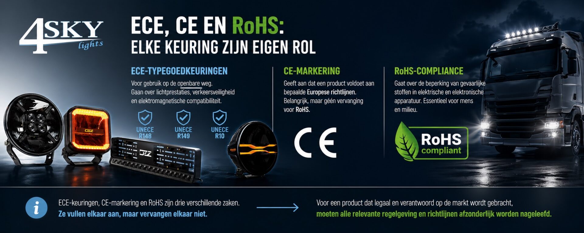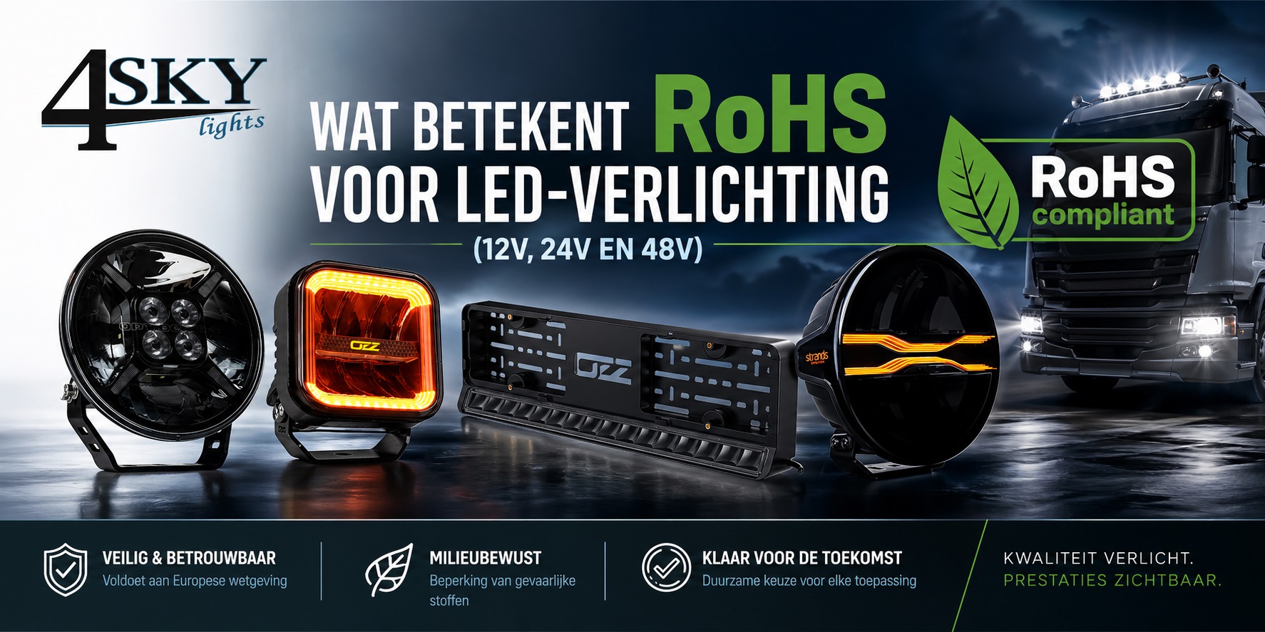 LED-verlichting die geschikt is voor voertuigen, zoals werklampen, verstralers en lichtbalken, valt in de meeste gevallen onder RoHS wanneer deze als los product wordt verkocht. Dit geldt ongeacht of het product bedoeld is voor 12V, 24V of 48V systemen. Zodra een product elektrische of elektronische componenten bevat en afzonderlijk op de markt wordt gebracht, wordt het gezien als elektrische apparatuur en is RoHS van toepassing. Dit geldt dus voor vrijwel alle aftermarket LED-verlichting. Voor originele voertuigonderdelen die af fabriek worden gemonteerd, kan een andere richtlijn gelden, namelijk de End-of-Life Vehicles Directive. Deze richtlijn bevat vergelijkbare beperkingen, maar is specifiek gericht op voertuigen.